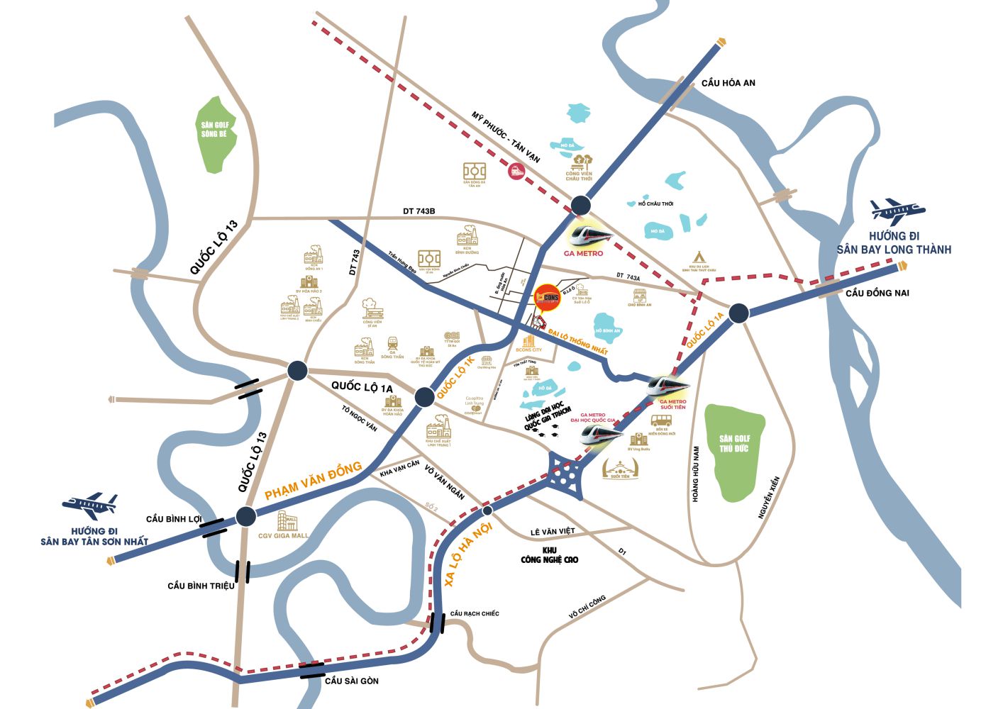 - Metro Số 1: Ngay nhà gà Suối Tiên, mất 10 – 20 phút di chuyển qua các khu vực Thủ Đức, Bình Thạnh, Quận 1 cũ,…Trong tương lai sẽ di chuyển thêm các khu vực sân bay Long Thành, Thành phố mới Bình Dương,…qua tuyến Metro số 1 kéo dài.