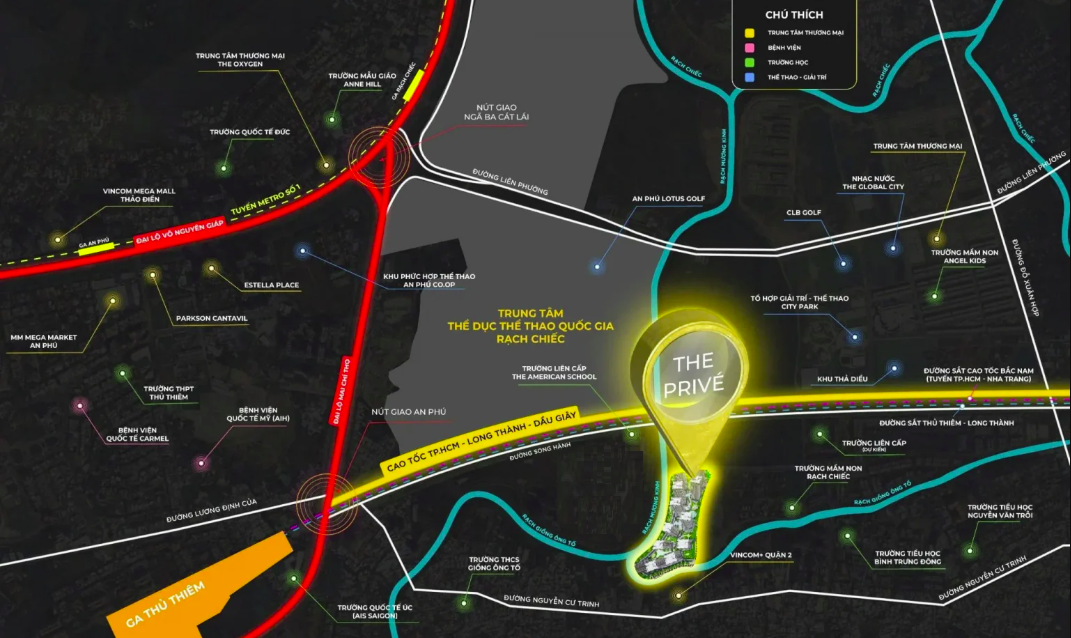 Địa chỉ dự án The Privé nằm tại Khu dân cư Nam Rạch Chiếc, Phường An Phú, TP Thủ Đức (Quận 2 cũ), TP. Hồ Chí Minh, ngay mặt tiền đường Song Hành cao tốc TP. HCM – Long Thành – Dầu Giây, có lợi thế 3 mặt giáp sông và kết nối thuận tiện đến trung tâm Quận 1 và các khu vực lân cận.