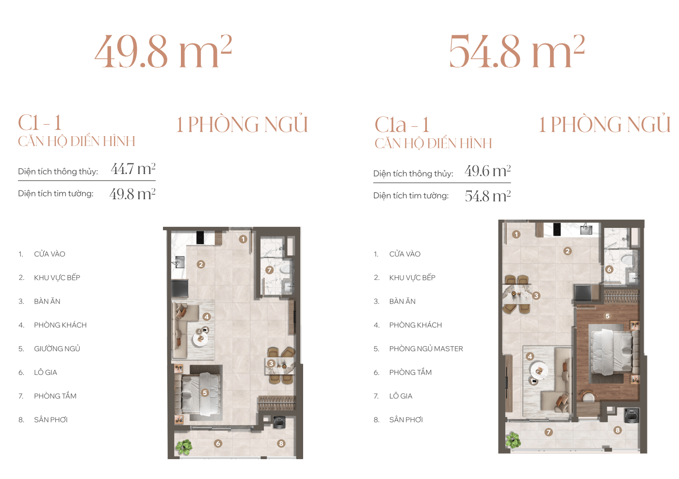 - Căn hộ 1 Phòng ngủ: 49.14 m2