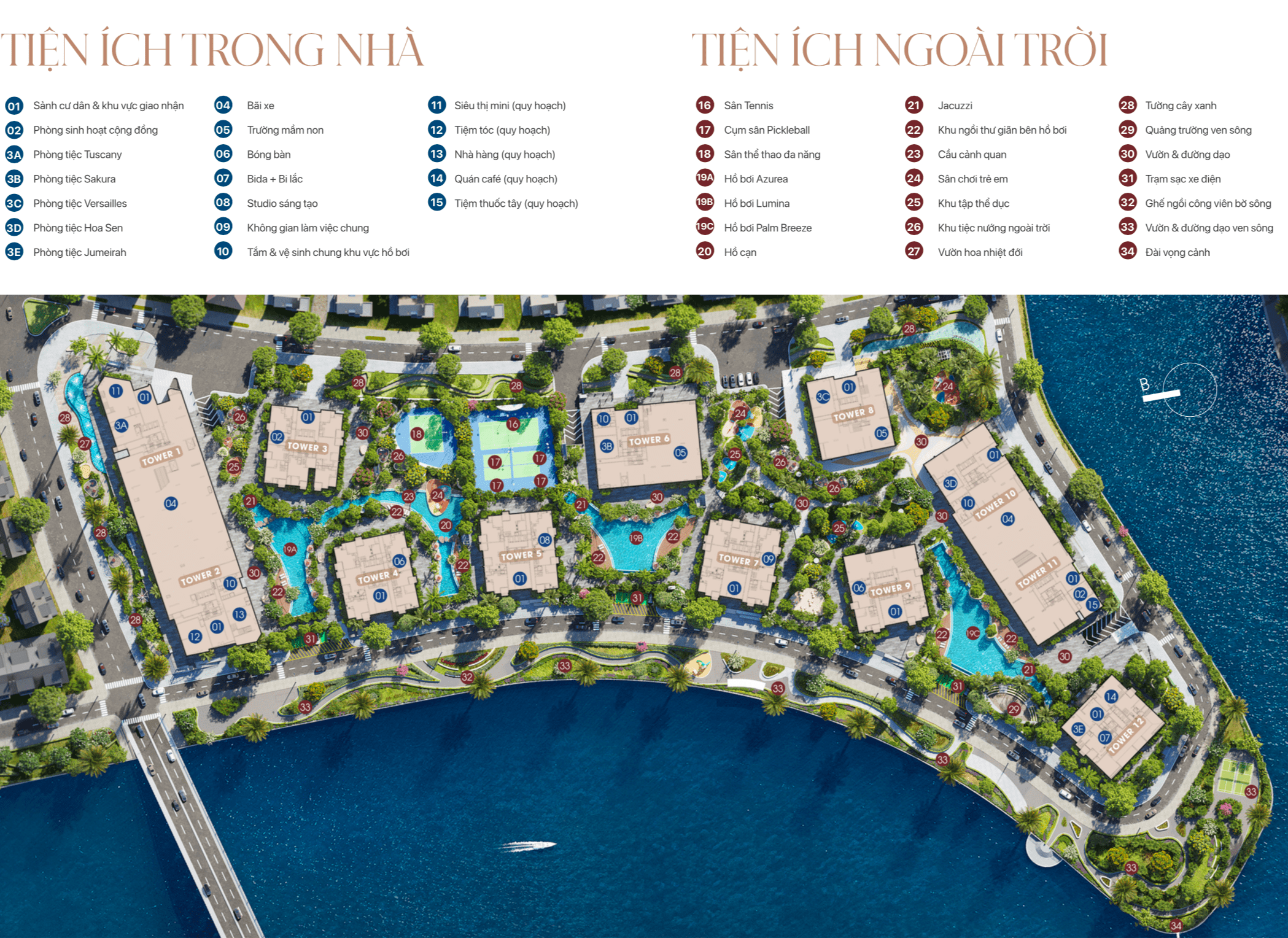 Tiện ích nội khu: Sảnh đón tiếp sang trọng lát đá Sapphire, thang máy, ba hồ bơi điện phân muối phong cách resort (Palm Breeze, Lumina, Azurea), phòng tập golf mô phỏng, phòng bi-a và bi lắc, thư viện, rạp chiếu phim mini & karaoke.Các trung tâm thể dục bao gồm phòng gym lớn với trang thiết bị hiện đại, phòng yoga, và khu tập quyền anh. Ngoài ra còn có sân pickleball, sân bóng rổ, khu BBQ ngoài trời, các sảnh tiệc sang trọng với tiện nghi bếp hiện đại và tầm nhìn vườn ven sông (Jumeirah, Versailles, Sakura, Tuscany, Hoa Sen lounges).